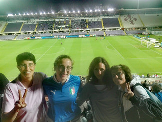 Sono le h.19,45 e dopo quasi 5 ore di viaggio ci troviamo all'ingresso dello stadio, giusto in tempo per assistere al riscaldamento delle azzurre. Marzia fresca fresca di doppio scudetto maschile e femminile della Juve, sfoggia il suo tricolore celebrativo, Betta dopo aver studiato per tutto il viaggio entra in clima partita indossando la maglia azzurra, Greta e Gin sfogano la loro sete di nazionale con due birre medie mentre Alison, con occhi a cuoricino, si per perde in brodo di giuggiole alla vista del suo idolo Martina Rosucci.